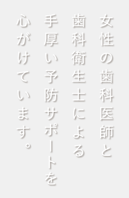 当院は、歯科衛生士が患者さまだけの「オーダーメードの予防ケア」をご提供し、皆さまの歯を守れるよう努めています。